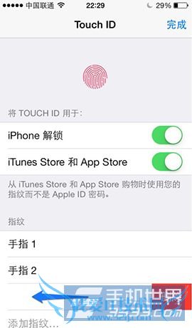 4)确定想要更换的指纹。比如这里我把“指纹3”替换掉,在指纹3上用手指 向左滑动,点击“删除”按钮即可,接下来点击“添加指纹”选项,就可以完成指纹修改。