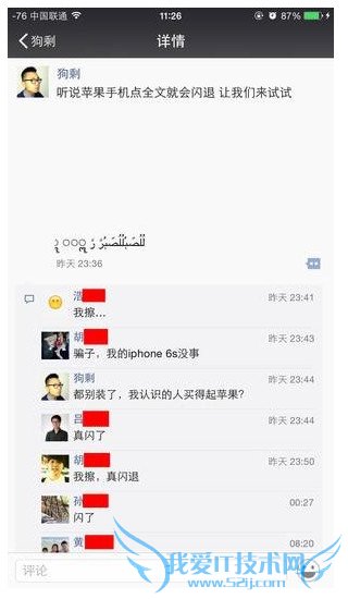 很简单,你只需要在你的朋友圈发一条简单的信息,吸引iPhone用户来点击,然后,就没有然后了,那堆iPhone的微信全部阵亡。无论他们心有不服,再次点击进来,也会同样遭遇闪退的尴尬。经过实测,几乎每一个点击查看该消息的iPhone用户都会闪退