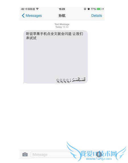 引起闪退的原因很简单,只有因为一串乱码而已。我们把这串代码复制出来,分别以邮件和信息的形式发送给iPhone,发现并没有出现闪退问题,说明这串乱码并不会对iPhone造成任何影响。不过由于闪退的都是微信、QQ、微博,所以,应该是这些社交软件对这串代码“过敏”,导致该软件直接闪退的。