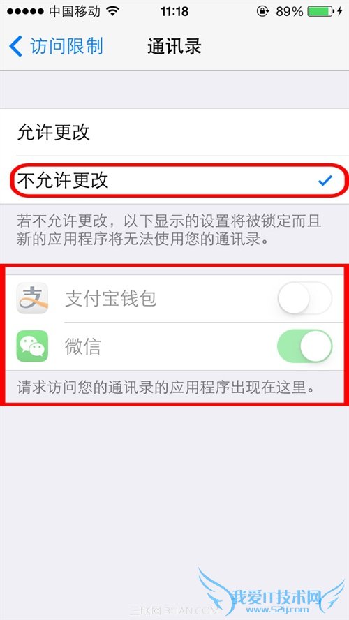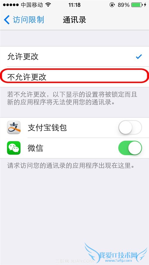 第8步:通讯录设置中默认为“允许更改”,即有应用程序要访问通讯录时,是可以进行提示并允许的。在下方的列表中我们看到已经有一些应用程序已经取得了访问通讯的权限,在本例中有支付宝钱包和微信,被禁止访问的是支付宝钱包。此时你可以单独对应用程序关闭开关禁止访问。如果想锁定当前的设置,并且不允许新增应用程序访问,还需要点击“不允许更改”。此时,列表将会被锁定不能修改;