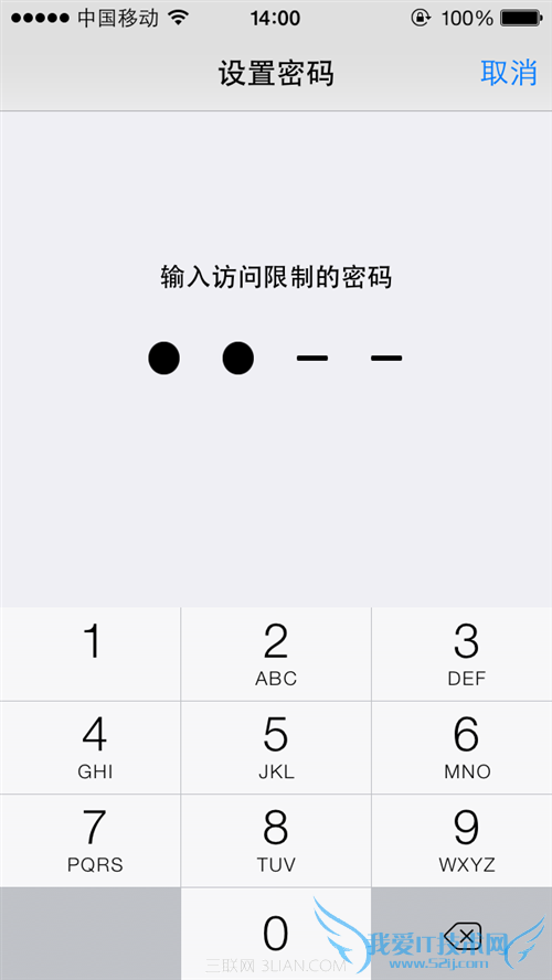 第5步:由于“访问限制”权限很大,将影响到很多重要的设置,所以为了安全起见苹果强制要为其设置四位数字密码。按小键盘可输入密码,为防止旁边有人偷窥,密码在手机上将统一以点显示;