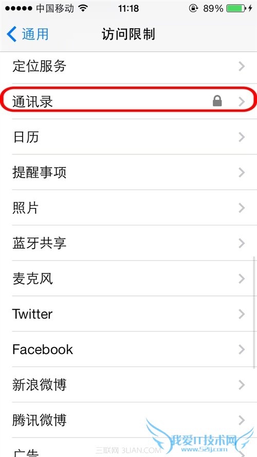 第7步:设置密码成功后,“访问限制”将可以使用,此时主列表中找到隐私项目中的“通讯录”,点击;