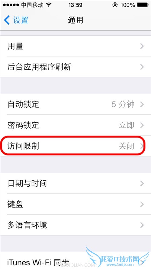 第3步:在“通用”设置中,找到“访问限制”。默认状态下,该项目为关闭状态,接下来我们要把该选项打开才可以使用相应功能。如果您已经打开了“访问限制”,输入密码后请跳到第7步;