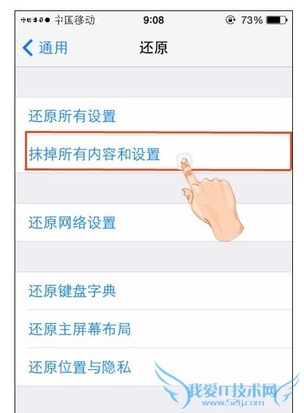 第三步:在“还原”选项页面,点击“抹掉所有内容和设置”。