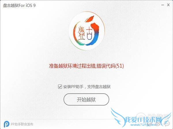 国内著名越狱团队盘古携手 PP 助手发布了 iOS9.0-9.0.2 正式版越狱工具,支持iPhone4s 等全系列可升级 iOS9 的设备越狱。不过有不少 iPhone 用户在越狱过程中出现「准备越狱过程环境出错,错误代码(51)」的错误提示,下面52IJ手机之家小编教大家解决方法。