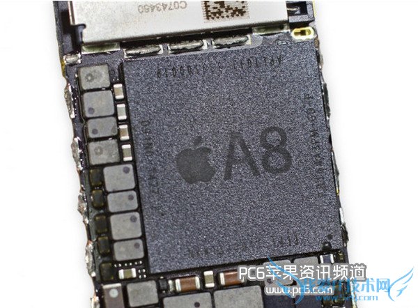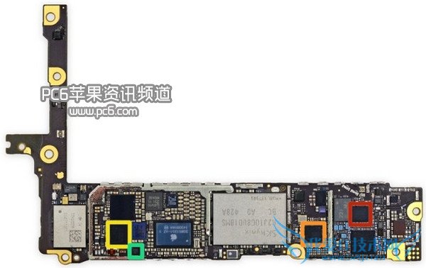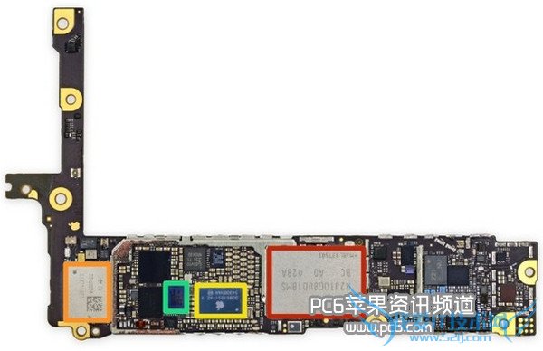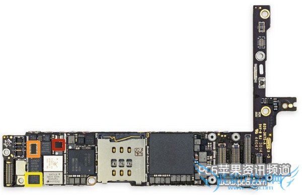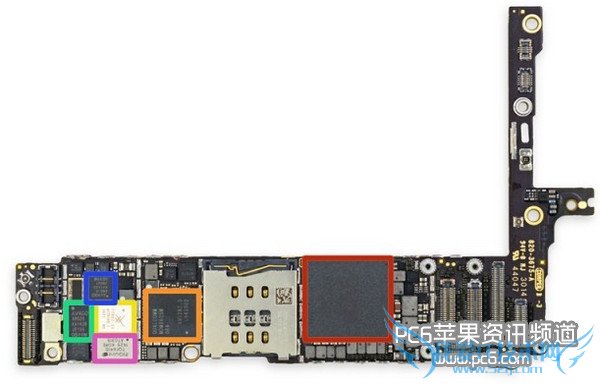 红色:A8处理器,编号APL1011(来自尔必达1GB LPDDR3内存和它封装在一起,编号是EDF8164A3PM-GD-F)