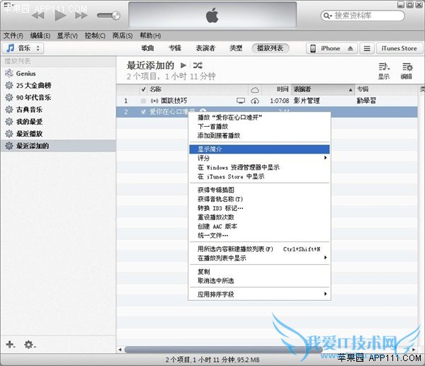第二步,添加完成后,可以在音乐页面,“最近添加的”选项页面,看到已经添加的音乐文件。打开该音乐文件的右键菜单,并点击“显示简介”。