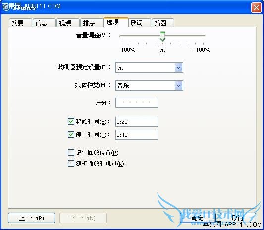 第三步,在弹出的窗口中,点击“选项”,再设置音乐的起始时间和停止时间,即选择铃声的音乐段,并确定。