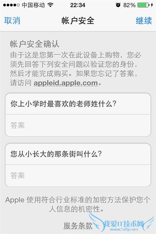 第五步:根据自己当初注册苹果账户时填写的相关信息,来完成账户安全的验证。如果忘记这些问题的答案,可访问appleid.apple.com来重置问题和答案。输入完成后点击右上方“继续”按钮。