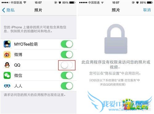 第三步:进入之后我们会看到手机中会访问“照片”功能的应用,我们只需要点击右侧的开关按钮就可以自行设置访问照片的应用了,比如我们不想“QQ”来访问照片,我们只需要关闭QQ的选项即可。