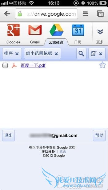 8.在Chrome浏览器地址框中输入https://drive.google.com/?,就可以进入如下图中的页面。可以看到刚刚我们保存的度娘网页已经保存为PDF格式了。您随时可以登录Google云硬盘,将其下载下来。