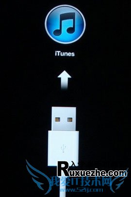 4、在同时按住HOME键跟电源键至关机状态下后,送开电源键(平时开关机的按键),【注:HOME键还是持续按住!】等待10秒左右,等待itunes连接信号。