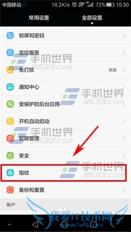 1)点击【设置】进入,在全部设置一栏,选择【指纹】。(如下图)