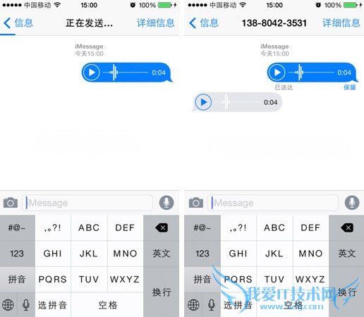 这个应该说是iOS8一个比较大的改变之一,不少用户都评测其在向微信靠拢,因为该功能的加入确实会让iMessage的消息发送方便许多。因为iPhone的普及率相当高,所以iOS8对于iMessage语音信息、快捷回复、群聊的功能添加,的确会方便很多人。语音信息就是给iMessage的联系人发信息时,右侧会有个蓝色的麦克风,按住它就开始录音了,向左滑动就是删除录音,向上滑动就是发送录音。