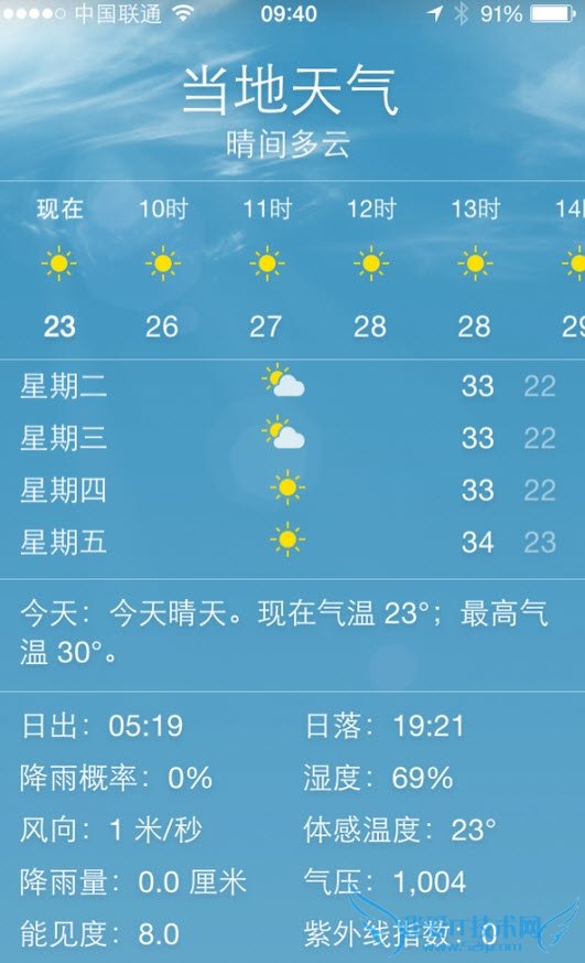 在iOS8的内置应用中,天气APP算是改观比较大的一个。在天气中显示的信息明显更多,原来iOS7只能显示最近5天的天气概括和最近12小时的天气,现在iOS8可以显示最近9天的天气概括和最近24小时的天气;另外,之前在iOS7中点击界面显示湿度等天气详情已经被挪至天气界面的最底部。