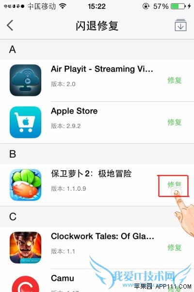 第二步,在“闪退修复”页面,可以查看手机上已安装的应用,点击需要修复闪退的应用就可以了,最好是WIFI网络流畅的环境下进行。如果修复后仍然闪退,重新下载闪退的应用,覆盖安装就可以了。