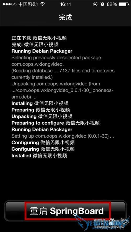 6、这个时候就会自动的安装。安装完毕之后,点击下方的重启SpringBorard。
