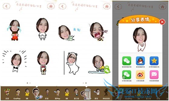 选定了头像后表情就开始生成啦,底下有卖萌、Cosplay、2B、重口味、悲催、震惊以及神秘表情等不同风格的动态图,只要点击你感兴趣的主题就可以实时预览表情效果,遇到喜欢的表情点击就能直接分享到微信、微博等社交平台,当然,如果你是个小娇羞,也可以默默的把喜欢的表情保存在“表情相册”中,自娱自乐也没什么不好的!