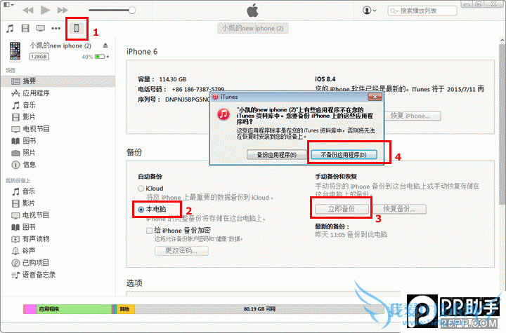 1. 我们需要先运行iTunes软件,并将手机与电脑进行连接,然后依次点击iTunes窗口左上角的手机图标,然后选择“本电脑”并点击“立即备份”按钮,然后在弹出的窗口中点击“不备份应用程序”,如下图所示,我们只需依次点击1,2,3,4处红框所标示的位置即可。