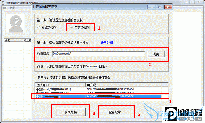 7. 打开“楼月微信聊天记录导出恢复助手”软件,设置微信版本为“苹果版微信”,数据目录选择我们刚才导出时所保存的“D:Documents”文件夹,然后点击“读取数据”按钮,界面将会显示该手机上所有登陆过的微信号码,我们选择一个想恢复聊天记录的微信号后点击“查看记录”按钮。