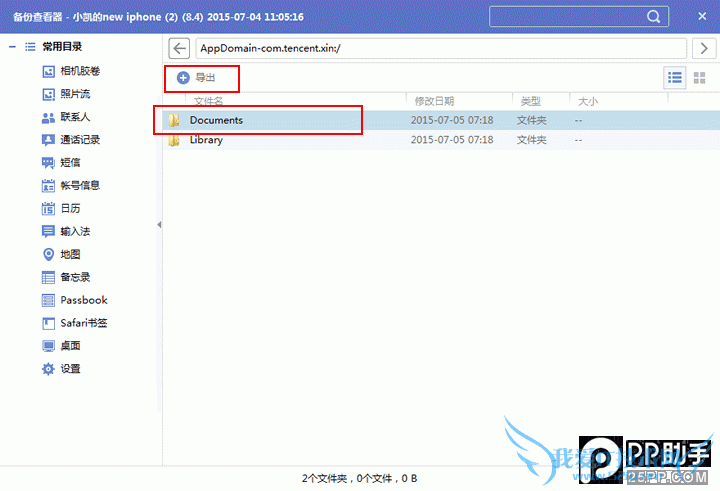 6. 在弹出窗口中单击选中“Documents”,并点击上方的“导出”按钮,我们在这里将其导出到D盘根目录下,当然您也可以任意设置保存的路径。