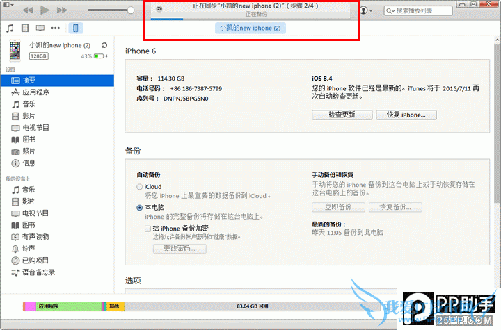2. iTunes在对数据进行备份时,窗口顶端将会出现进度条显示当前是否已经完成备份。当进度条消失后,说明备份已经完成。备份比较消耗时间,需要花费几分钟到几小时不等。备份时界面如下图所示:
