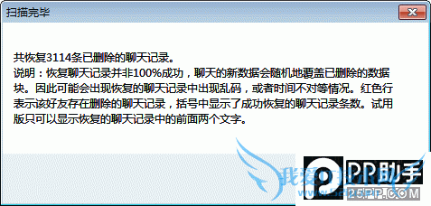 9. 稍等片刻后,软件将弹出窗口提示成功恢复的聊天记录条数,如下图所示,成功恢复了3114条已删除的微信聊天记录。