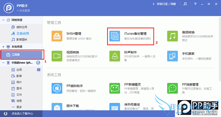 3. 接下来我们打开“PP助手”软件,并点击左侧的“工具箱”,然后点击右侧的“备份管理”,如下图所示: