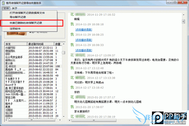 8. 主窗口上将会显示该好友所有的微信好友及所有聊天记录,但此时显示出来的只是未删除的聊天记录。我们点击“文件”,“恢复已删除的微信聊天记录”菜单。