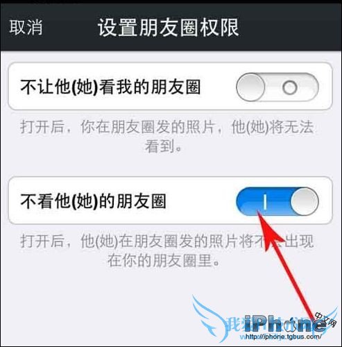3)点击“不看他(她)的朋友圈”为打开状态即可屏蔽(如果想恢复查看,则同样的点击“不看他(她)的朋友圈”为关闭状态即可恢复)。