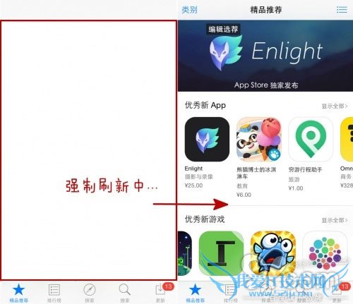 出现上述两种情况时,你可以对着底部的任意一个标签按钮连击10次,App Store就会立即强制刷新,就是这么简单粗暴!