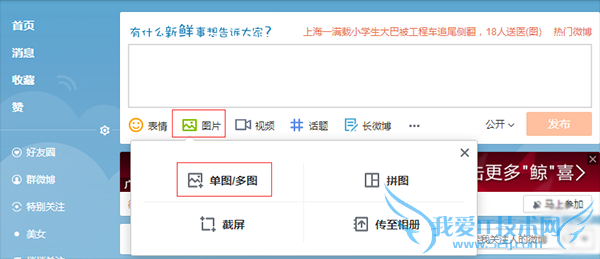 3. 基本上,到了这一步已经接近尾声了,只要将这张图片上传到微博即可。打开微博,点击图片 > 单图/多图,在弹出的窗口中选中刚刚生成的 GIF 动图,就可以发布了。