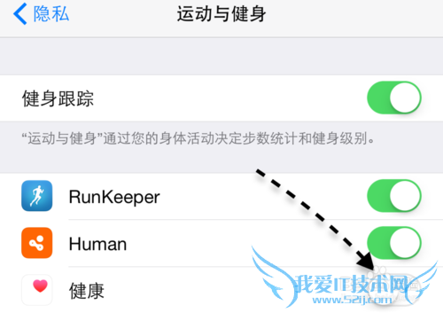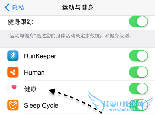 4、在列表中可以看到有“健康” 一栏的开关选项,即为控制是否要让 iPhone 自动记录我们的运动数据。