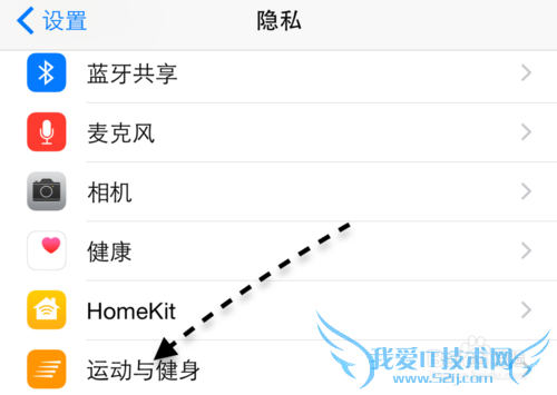 3、在隐私列表里点击“运动与健身” 一栏,点击打开。