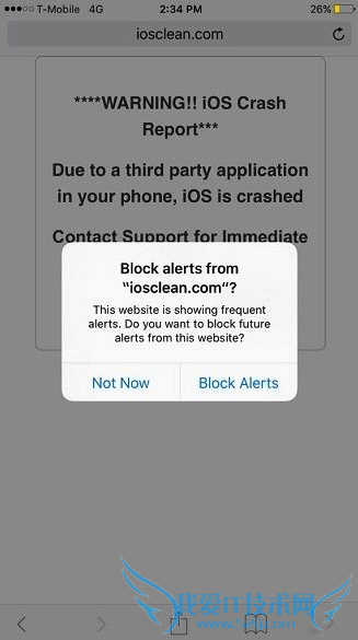 据芬兰安全机构 F-Secure 称,为了降低这一安全隐患,苹果为 iOS 9 的 Safari 浏览器添加了阻止弹窗功能。这项功能指的是一旦 Safari 检测到网站重复出现弹窗提示,便会提示是否禁止该网站的提醒,如图所示点击“Block Alerts”即可禁止网站继续弹窗。