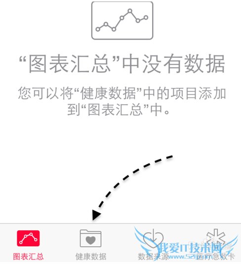 1.第一次打开“健康”应用以后,会显示健康应用的图表汇总,可以看到当前并没有显示任何有关数据。此时请点击底部的“健康数据”一栏,如图所示