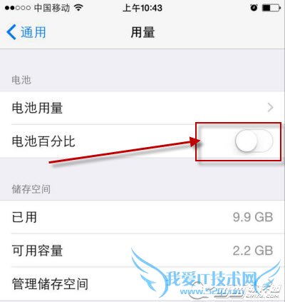 3,点击“用量”,往下滑动,找到“电池百分比”,用手指点击将其打开,这时打开状态显示为绿色