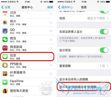 第2步:进入通知中心之后,在里面选择“信息”.找到“显示以下人员的iMessage提醒”,在里面选择“显示来自我的通讯录的提醒”选项。