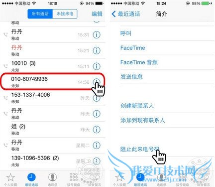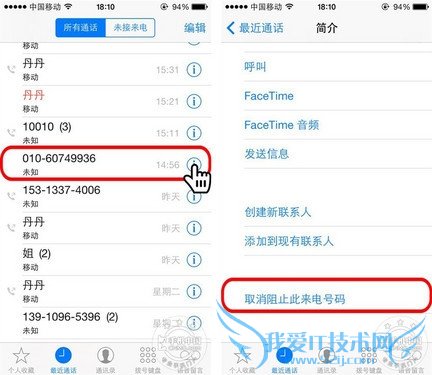 如果要拦截陌生的电话号码,可以在最近的通话记录中找到要阻止的电话号码,然后点击感叹号,进入详细页面,选择阻止此来电号码,阻止号码后你将不会受到黑名单中的联系人来电,短信和FaceTime呼叫。如果要取消阻止点击取消阻止此来电号码即可。