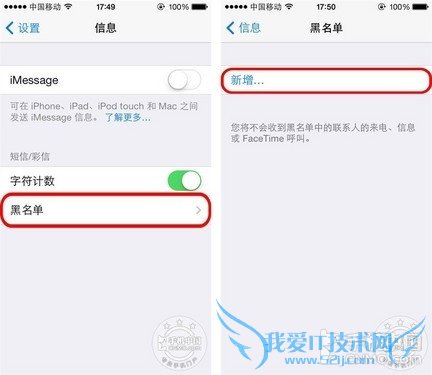第3步:新的系统增加了一个黑名单的屏蔽功能,点击设置,选择信息,点击黑名单。选择新增,然后系统会自动弹出你的所有联系人,选择你要屏蔽的联系人,你将不会收到黑名单中联系人的来电,信息或者FaceTime呼叫。