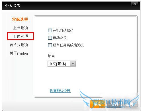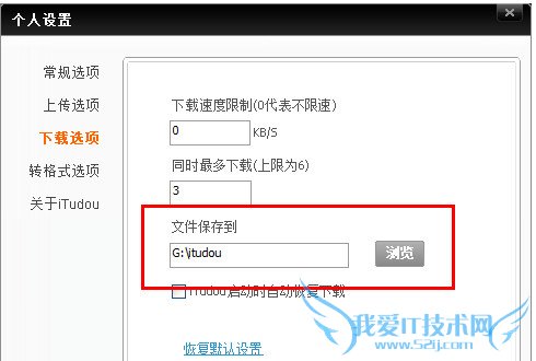 4、我们可以更改下载视频存放的地方,点击“浏览”,例如,我在 G:盘新建了一个名为 itudou 的目录,然后把下载视频的位置更改为G:itudou,然后点击“确定”。