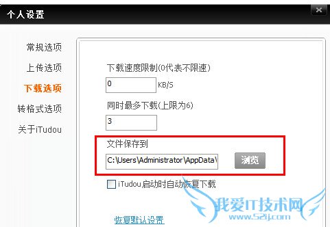 3、接下来,在下载选项中,我们可以对下载的速度和数量进行限制设置。还可以看到itudou 视频下载文件存放的路径。系统默认会把下载的视频文件存放在 C:盘目录中。当我们视频下载多了,视频占用C盘的空间也会越来越大,导致系统运行速度缓慢,并且默认的存放路径也不便于我们查找和打开。