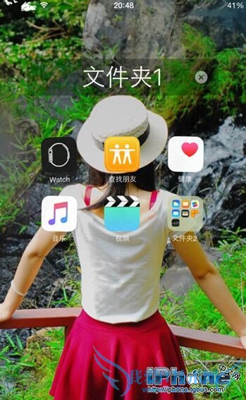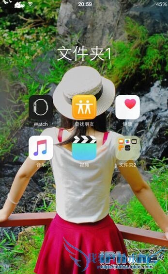 1、首先建立两个文件夹!然后把第一个文件夹(下称文件夹1)放到屏幕图标第二个位置上,如图一样,然后把要隐藏的App放到第二个文件夹(文件夹2)里,这里演示的是隐藏【天气】和【邮件】图标。