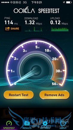 可以看到下行速度维持在1.3Mbps,而上行速度比较悲催,延时方面也超过了100ms,整体速度与电信和联通的3G速度相比处于劣势。不过相比以往移动iPhone用户使用2G的E网,下行速度已经提升了很多,网络体验有了明显的提升。不过因为延时仍然较高,可能用户在日常浏览网页的速度快感的感知上没有其余运营商的2G到3G网络要强烈。
