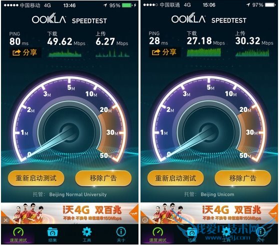 ▲在北京用移动4G(左)和联通4G(右)的网速