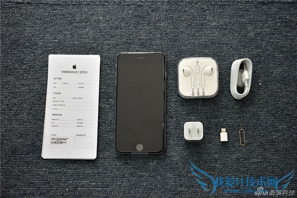 打开包装,拿出手机后,两款手机的配件也完全相同,就是充电器、EarPods耳机、数据线和行货iPhone标志性的闪电转microUSB接口,以及包含苹果logo贴纸的几份文档,分别是:三包凭证、环保声明、按键指南和一张信息提示。