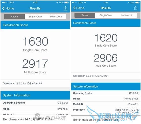 ▲iPhone 6和6 Plus在GeekBench软件上的跑分结果