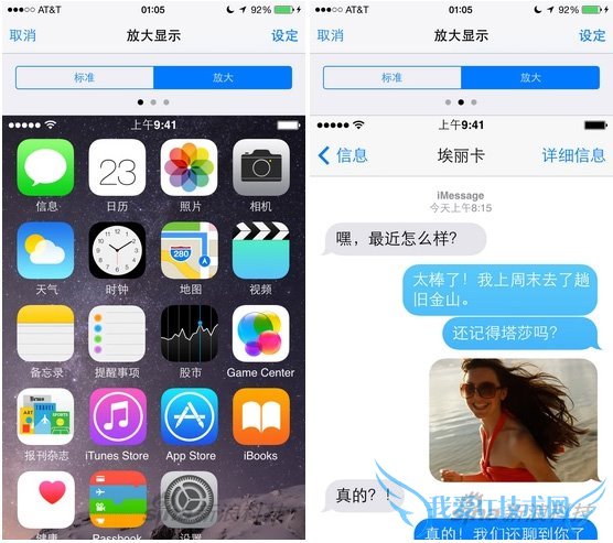 另外,苹果为iPhone 6和iPhone 6 Plus增加了“放大显示”功能,简单来说就是可以把主菜单、信息和邮件等的图标和应用变大显示变大,再加上字体大小调节功能,对于想为家里父母买iPhone的网友来说是个好消息。