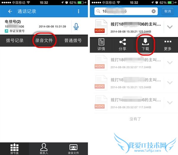 步骤4:通话结束后在通话记录里即可找到录音记录,点击“录音文件”进入后选择相应时间段的录音即可下载。
