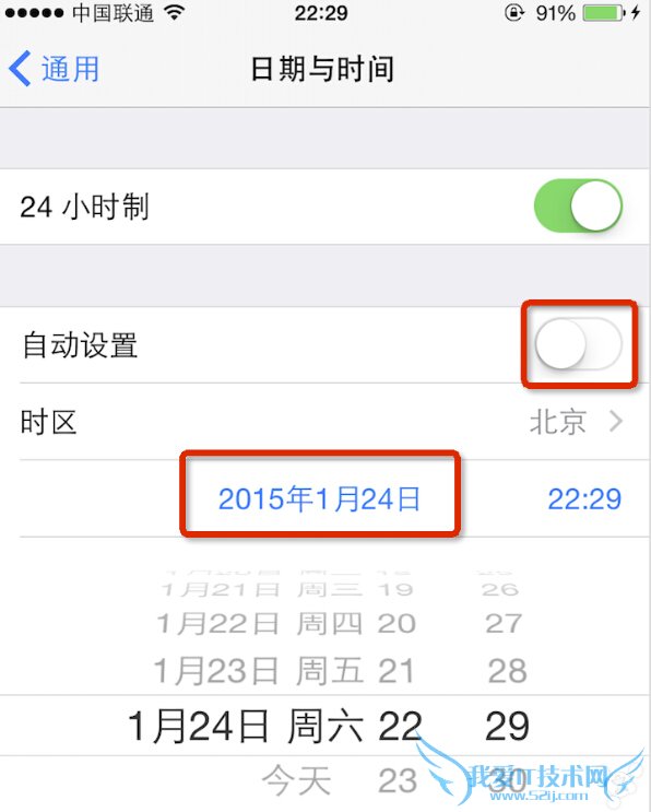 关闭自动设置,时间调到昨天(24日)或以前。如图: